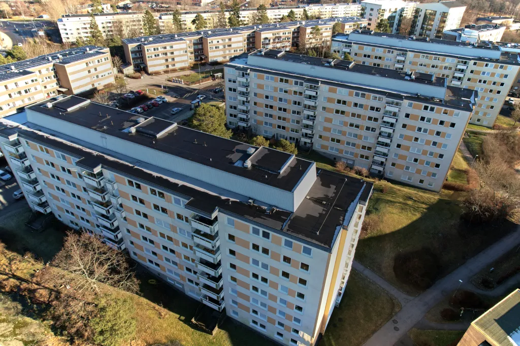Här moderniserades fastigheterna med ett nya tätskikt samt uppförda väggar med PIR-isolering och plåt. Åtgärderna förbättrar energieffektivitet, skyddar mot väderpåverkan och ger en långsiktig och tekniskt hållbar lösning anpassad för större bostadshus.