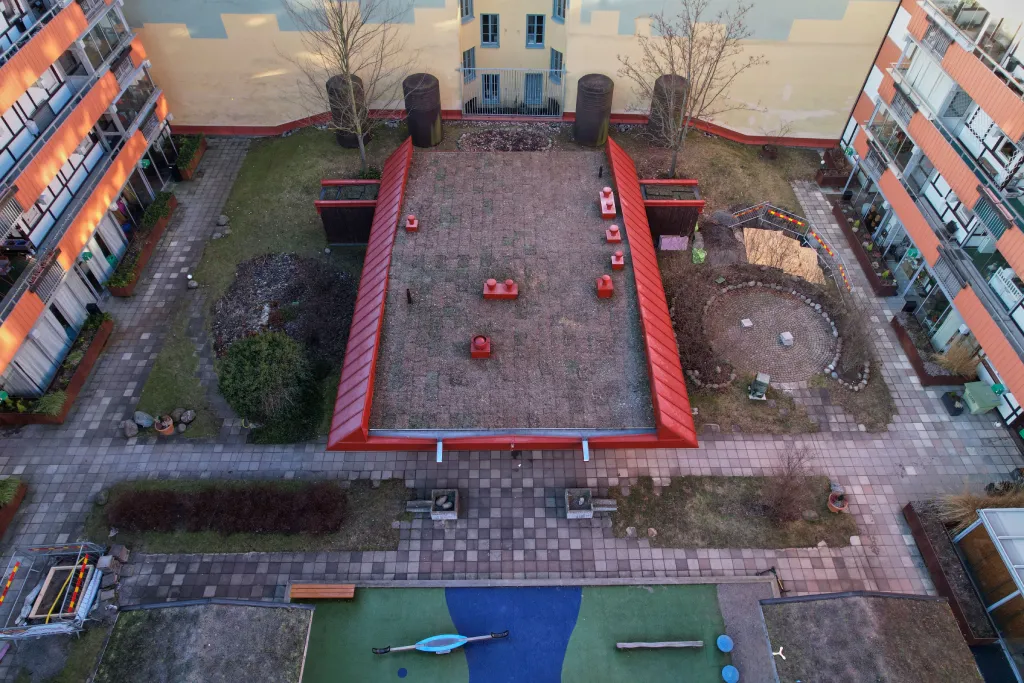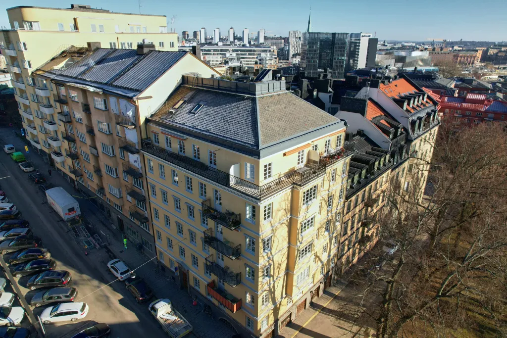 Här utrustades innergårdsbyggnaden med ett sedumtak för bättre dagvattenhantering, isolering och estetiskt uttryck. Nya plåtdetaljer monterades för att säkerställa täthet, hållbarhet och en korrekt teknisk anslutning mellan tak och fasad.